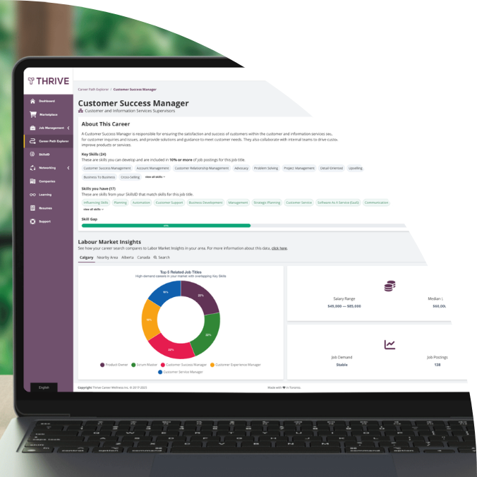 Thrive also supports employers in the labour market ecosystem with a suite of employer tools and solutions that help them navigate their talent needs, support outgoing employees, upskilling their existing team, or hiring candidates with the right skills.